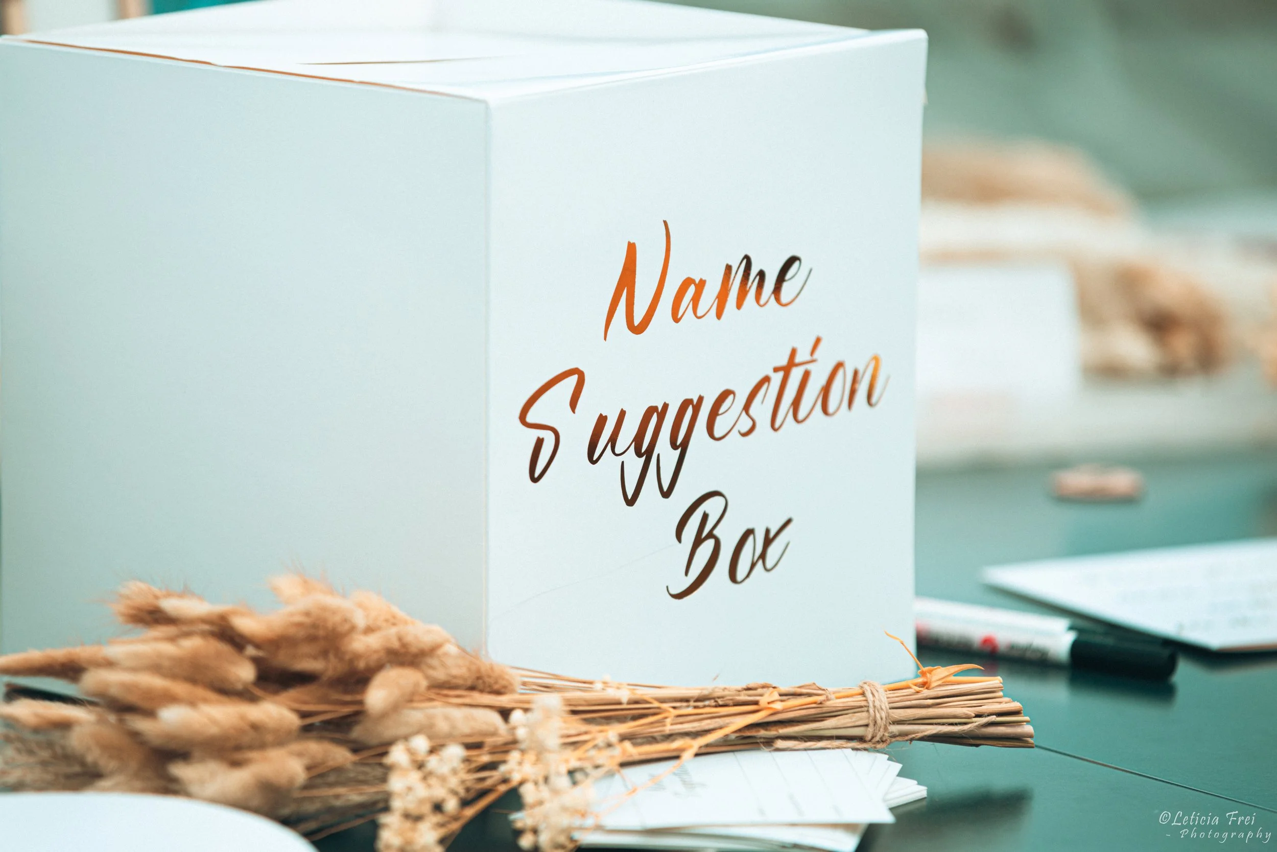 Une boîte blanche avec l'inscription 'Name Suggestion Box' en lettres cursives, entourée de plantes séchées et de papiers, probablement pour recueillir des suggestions.