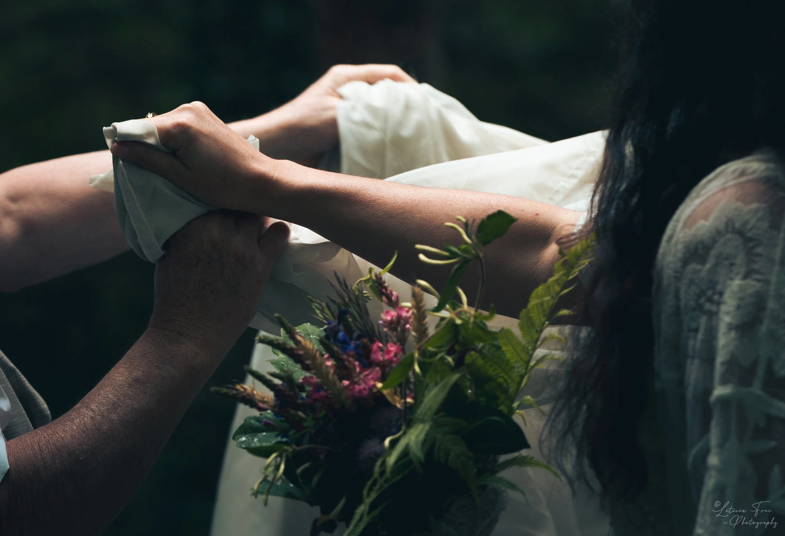 Main d'une personne tenant la main d'une autre personne, avec un bouquet de fleurs près d'eux, dans un cadre sombre et intime.