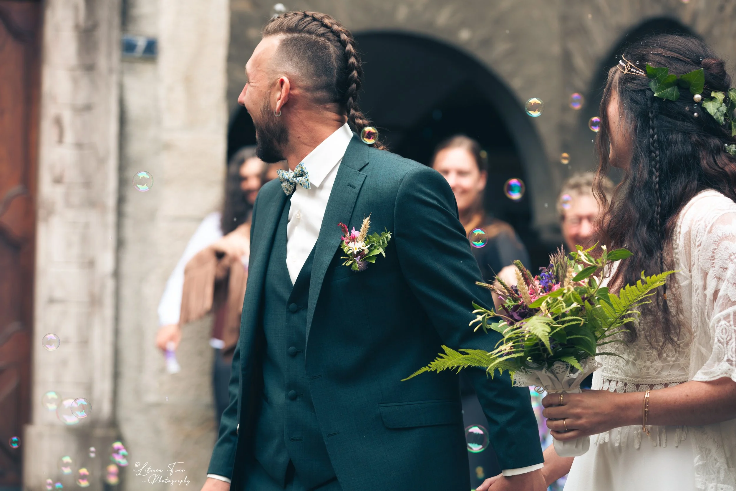 Un couple en costume de mariage, tenant la main, lors d'une cérémonie extérieure, avec des invités en arrière-plan et des bulles de savon dans l'air.