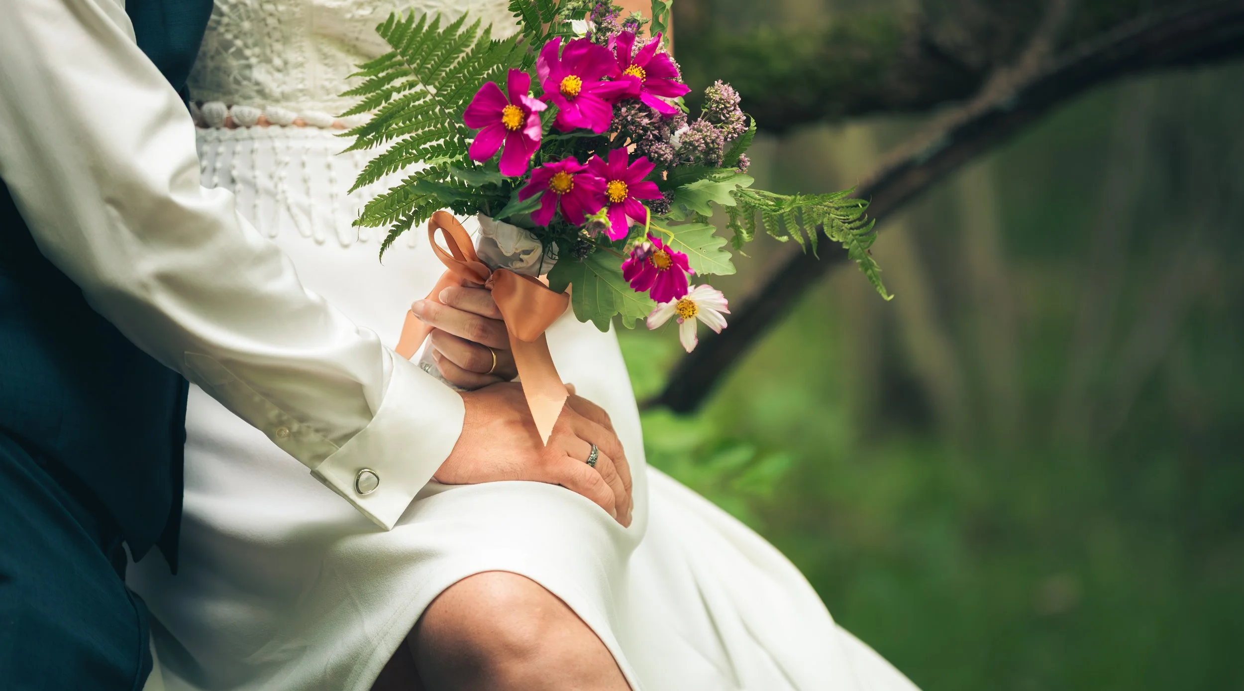 Des mains tenant un bouquet de fleurs colorées, dont des marguerites roses et des fougères, sur fond de nature verte.