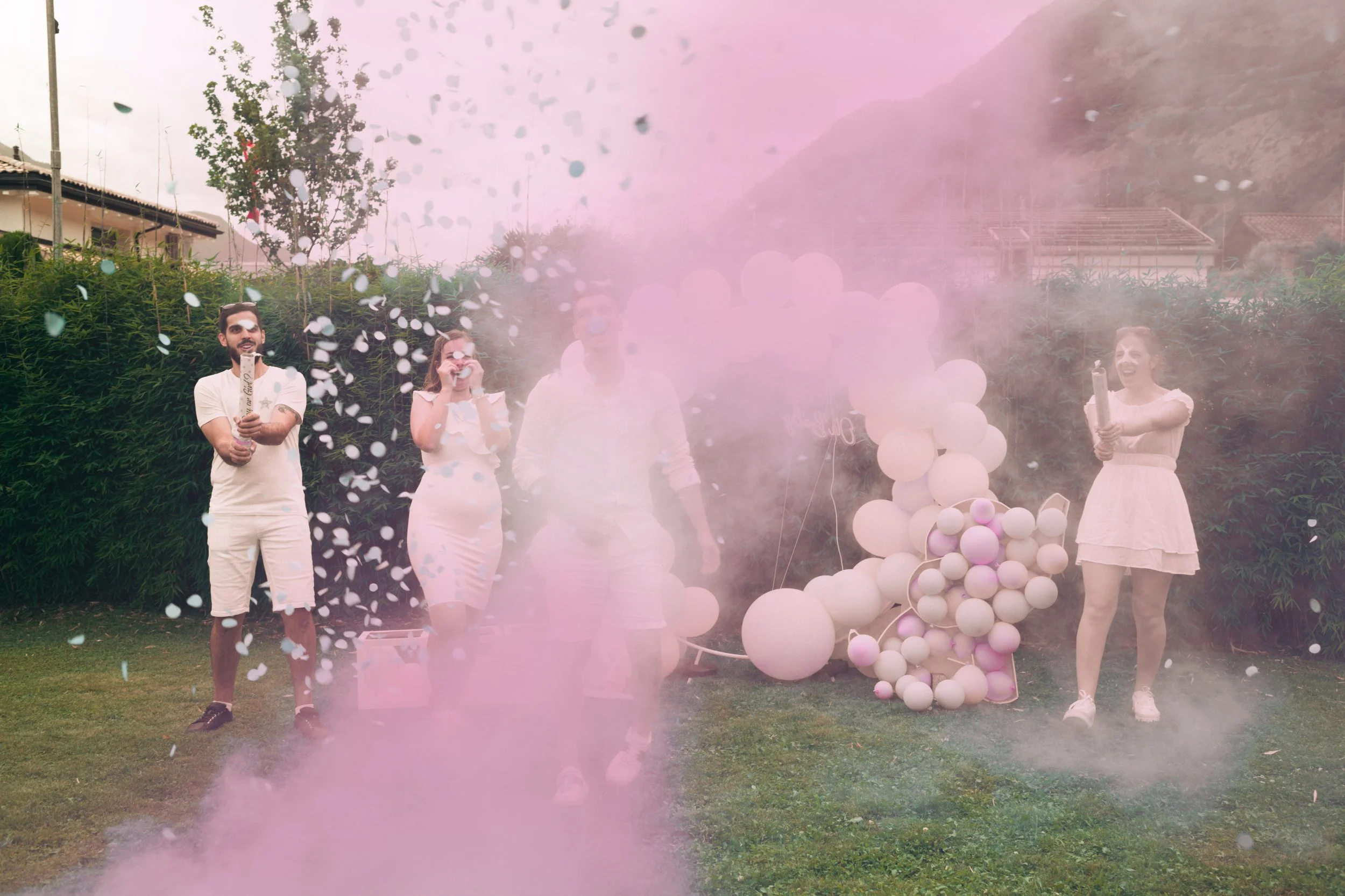 Groupe de personnes célébrant lors d'une fête en extérieur avec des ballons blancs et du fumigène rose, en présence de verdure et d'un décor festif.