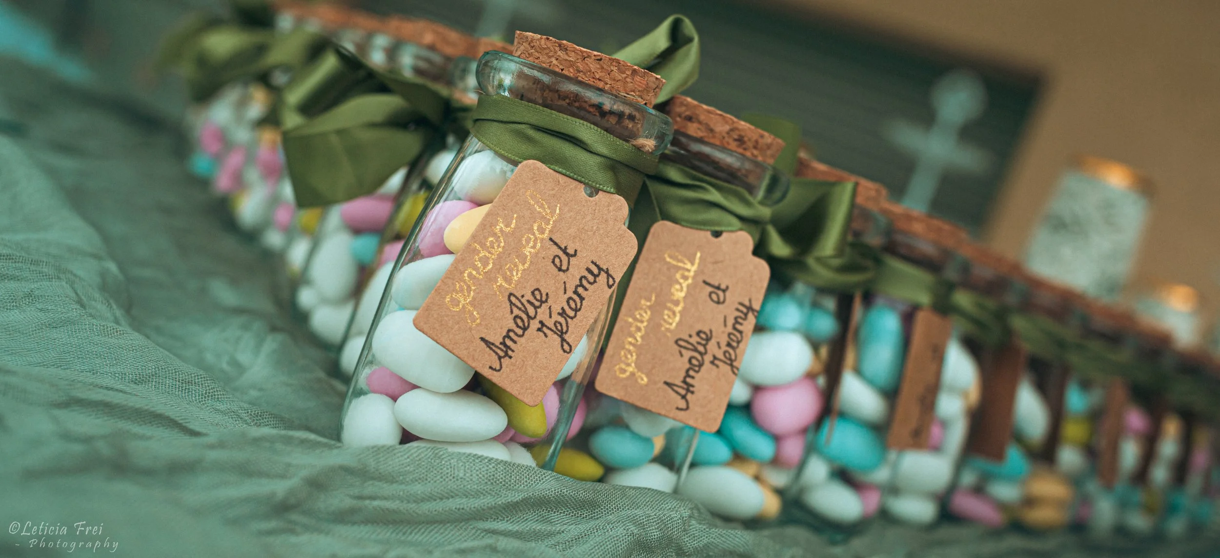 Boules de confiserie pastel dans des bocaux en verre avec étiquettes en carton, décorés de rubans verts, posés sur un tissu vert, avec une présence floue d'autres bocaux en arrière-plan.