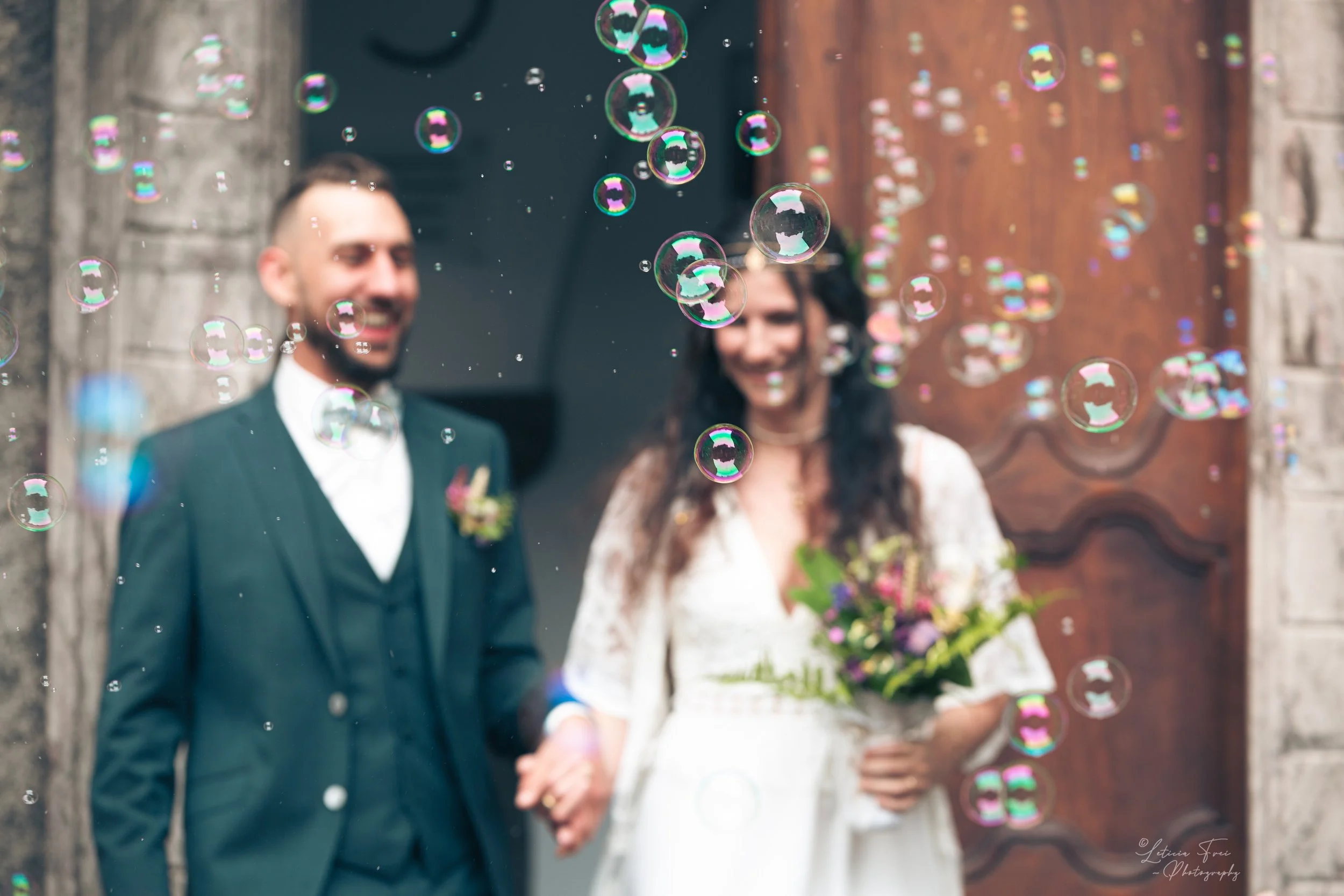Un couple marié, un homme en costume sombre et une femme en robe blanche, tenant une bouquet de fleurs, devant une porte en bois, entouré de bulles de savon.