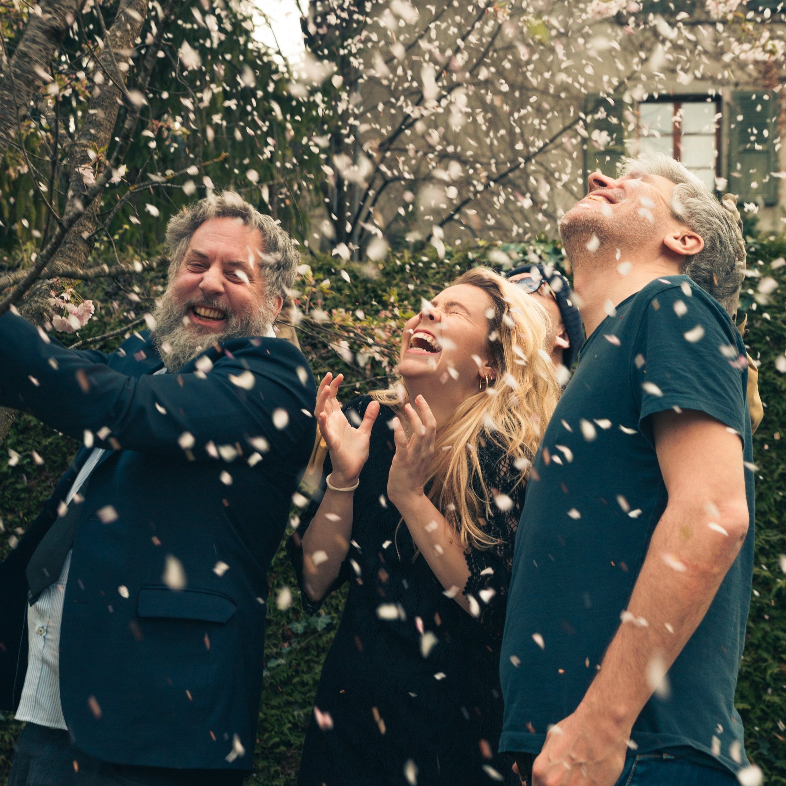 Trois personnes souriantes et riant sous des confettis dans un jardin.