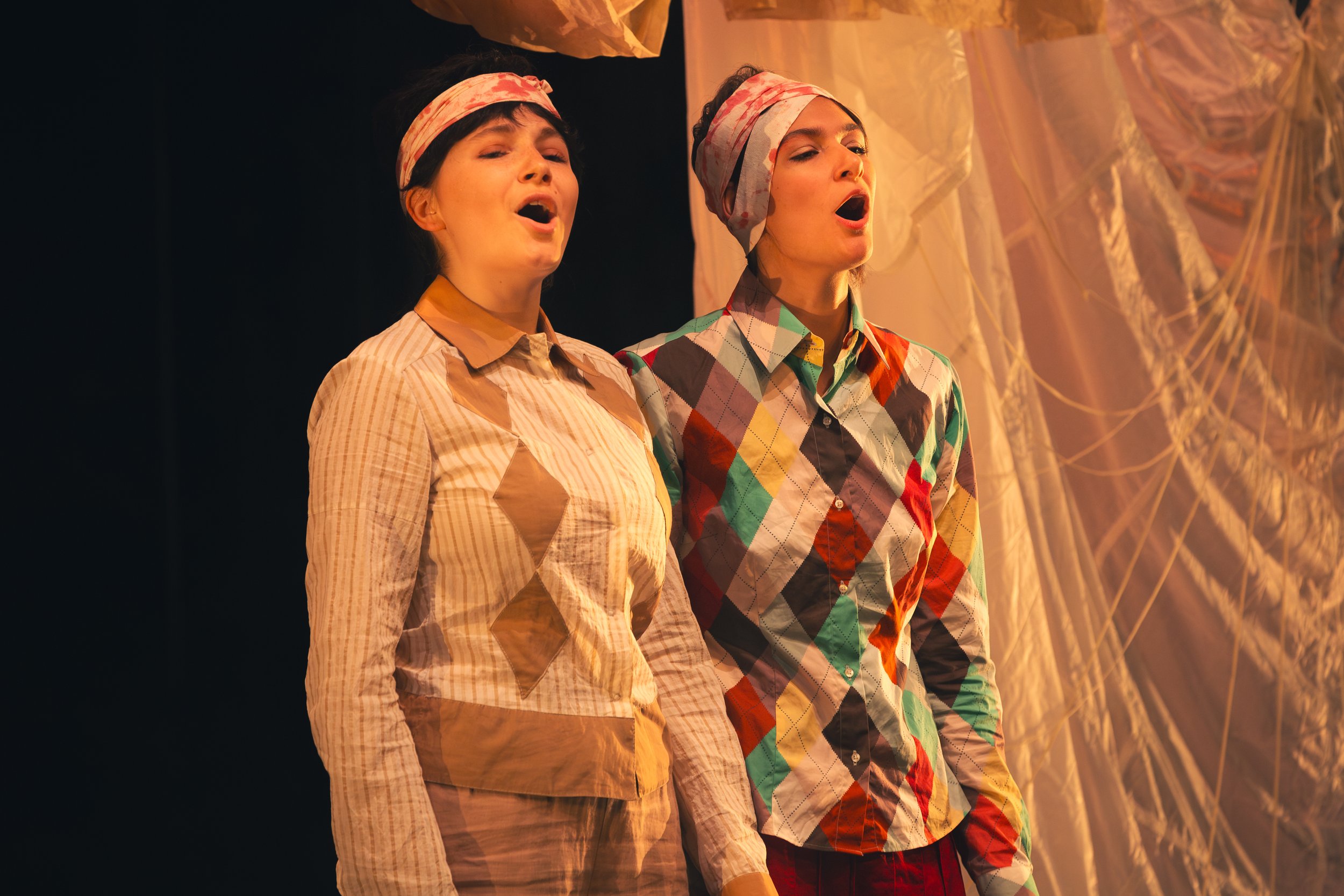 Deux femmes en vêtements colorés chantent ou parlent sur scène, portant des foulards sur la tête, avec un décor de tissu en arrière-plan.