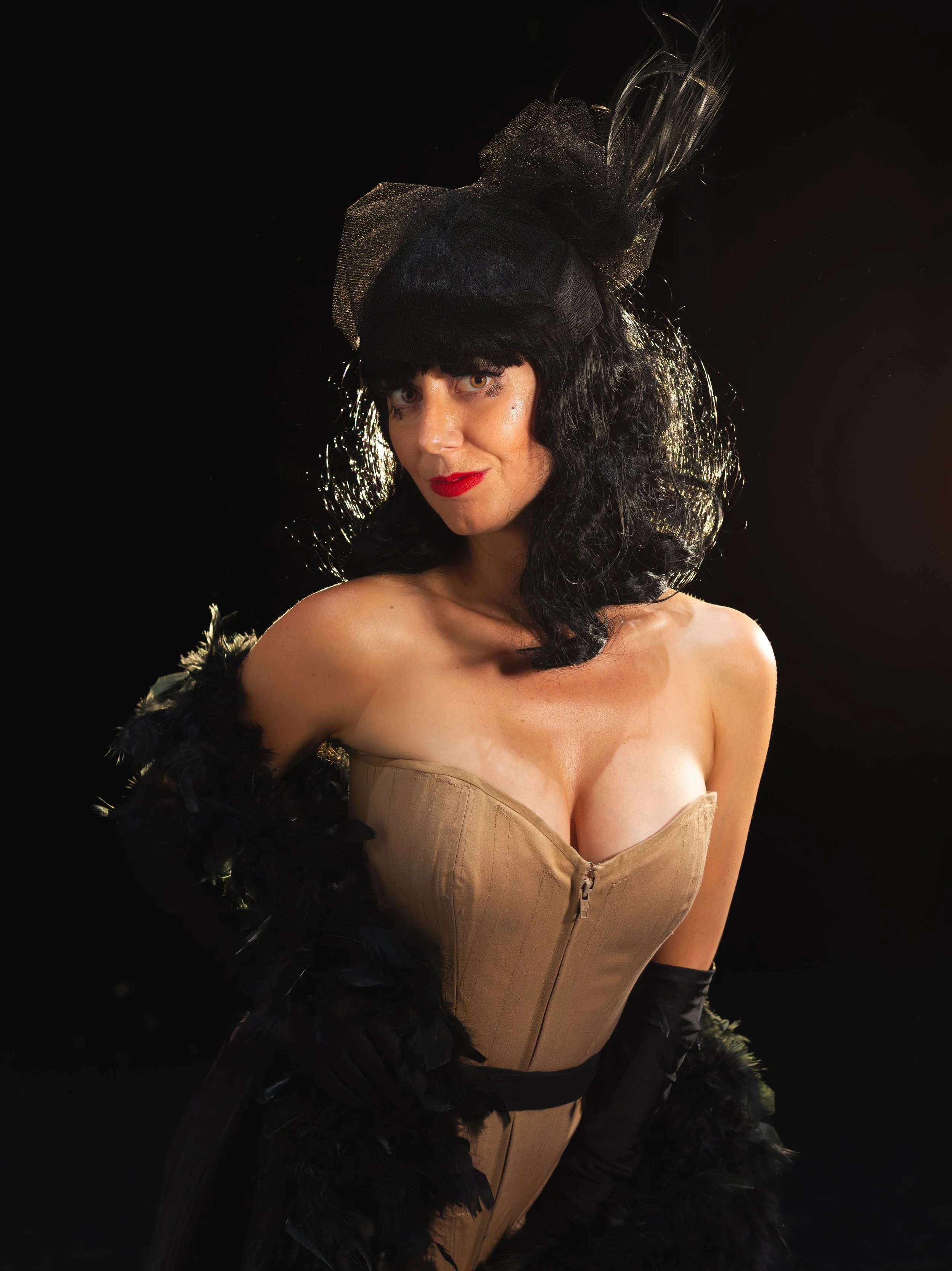 Une femme portant un corset beige, des épaules nues et un sac à main noir. Elle porte également un couvre-chef noir orné de tissu en tulle et de plumes, avec des gants noirs. Fond noir.
